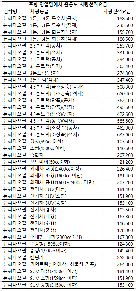 | 포항 영일만에서 울릉도 차량선적요금 | ||