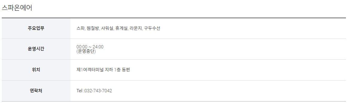 인천공항 제1여객터미널 지하1층 스파온에어 전화번호, 운영시간, 위치